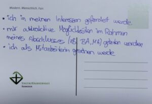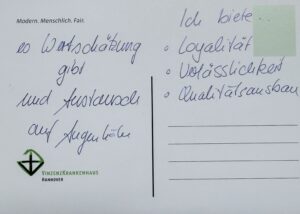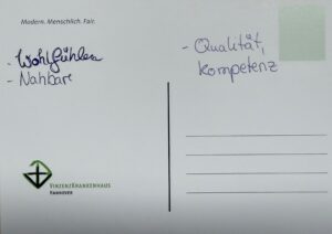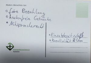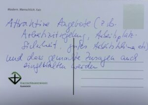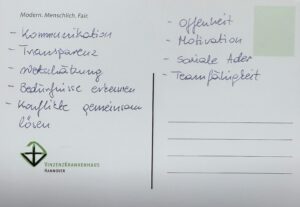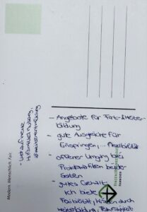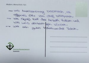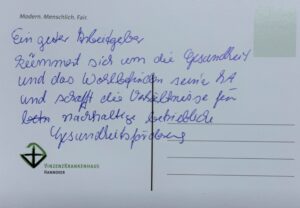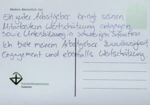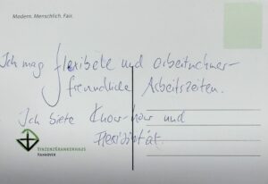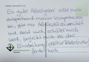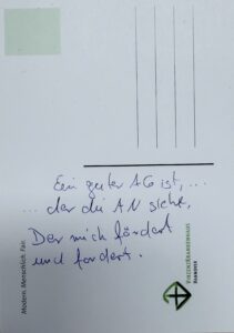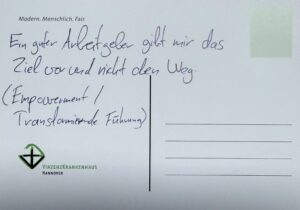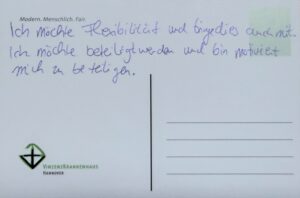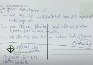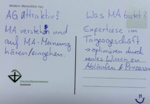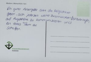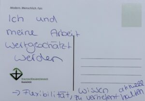 Ihre Gedanken hielten die Besucherinnen und Besucher auf Postkarten fest. Diese vielfältigen Antworten machen deutlich, wie differenziert die Anforderungen an Arbeitgeber heute sind – und wie wichtig es ist, Pflege gemeinsam weiterzudenken.
