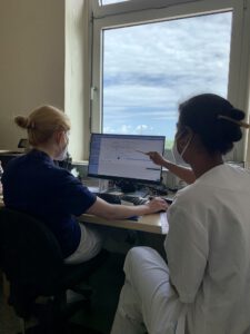 Das Aufgabenfeld eines Stationsapothekers ist also sehr vielseitig, und es variiert von Fachabteilung zu Fachabteilung. „Auf einigen Stationen kann ich den Alltag und die Chef- und Oberarztvisiten unmittelbar begleiten, auf anderen Stationen haben wir feste Zeiten für Kurvenvisiten“, erzählt Danynaveena Rajanathan. Der Begriff der Kurvenvisiten weist darauf hin, dass zwar Patientenkurven – heute umfassende digitale Patientenakten – herangezogen, Patienten aber nicht persönlich aufgesucht werden. „Das Vinzenz nimmt die pharmazeutische Unterstützung nsehr gut und ohne Berührungsängste an“, sagt Danynaveena Rajana than. „Ein schönes Beispiel ist die Zusammenarbeit mit der Geriatrie. Ihr Leiter Alexei Cabanillas Diaz hat das Konzept von Anfang an unterstützt. Dort haben wir freitags nach der Teambesprechung um 8.30 Uhr einen festen Termin für die Kurvenvisite. Vorher schaue ich mir die Laborwerte genau an und achte zum Beispiel auf die Nierenfunktion. Ist diese eingeschränkt, müssen einige Arzneimittel, die über die Niere ausgeschieden werden, in ihrer Dosierung angepasst oder abgesetzt werden.“ Bei der Kurvenvisite bespricht sich Danynaveena Rajanathan mit den Stationsärzten. Sie sieht Medikamentenkurven nach Auffälligkeiten durch und spricht Empfehlungen aus. Häufig geht es um Interaktionen (Wechselwirkungen zwischen Medikamenten) oder Kontraindikationen, also Umstände, die eine an sich zweckmäßige Medikamentengabe verbieten. Seit Anfang Juli 2021 sind mehr als 1.100 Medikamente in digitaler Form angelegt. Die Pandemie schränkt die Apothekerin nicht weiter ein, sodass die Stationsarbeit wieder in vollem Umfang möglich ist. Danynaveena Rajanathan hat viel vor: „Ich freue mich darauf, meine Arbeit auf weiteren Stationen auszubauen.“